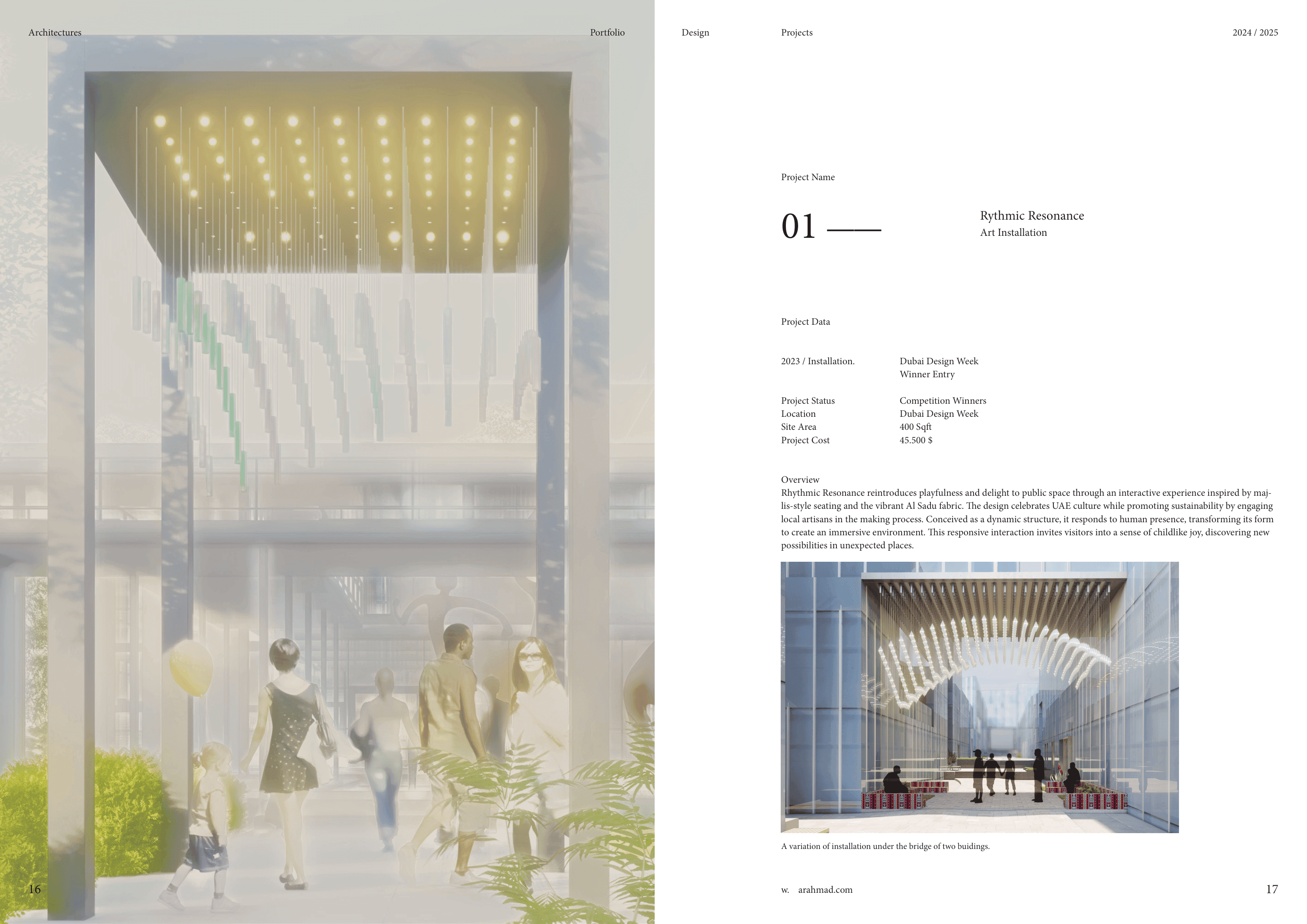 Rhythmic Resonance reintroduces playfulness and delight to public space through an interactive experience inspired by majlis-style seating and the vibrant Al Sadu fabric. The design celebrates UAE culture while promoting sustainability by engaging local artisans in the making process. Conceived as a dynamic structure, it responds to human presence, transforming its form to create an immersive environment. This responsive interaction invites visitors into a sense of childlike joy, discovering new possibilities in unexpected places.